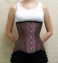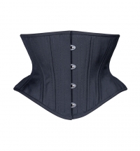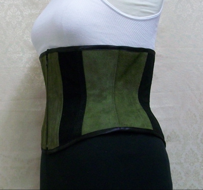 This piece is in our Delicious Boutique and ready to ship! This Cocteau style waist cincher specifically targets the waist. This corset is made of black and olive colored suede! This two layer corset is lined in black cotton coutil for sturdiness, spiral boned, and reinforced at the waist, zipper, and grommets. This piece can close to a 30" corseted waist for a natural waist of 34". It rises up on the sides over the hip. It has an 8" black zipper closure at the front. It laces closed in the back over a modesty panel to protect your skin. Two pairs of garter loops are standard for detachable garters. This bold corset is unisex (don't be afraid boys!) and can be worn with a simple shirt and your favorite pair of jeans. The touch, the feel of suede, the fabric of our lives.