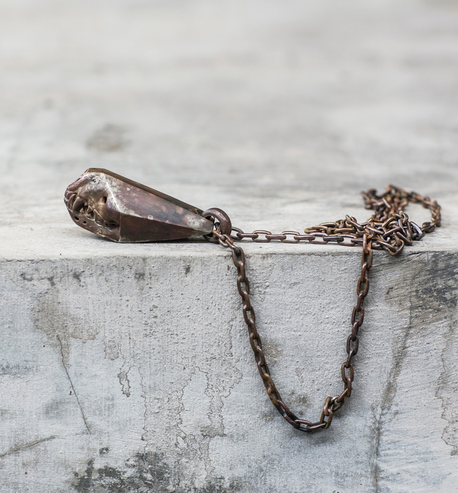 Hand cast in white brass and hung from hand formed white brass chain. Burned with fire to create a transformative patina.