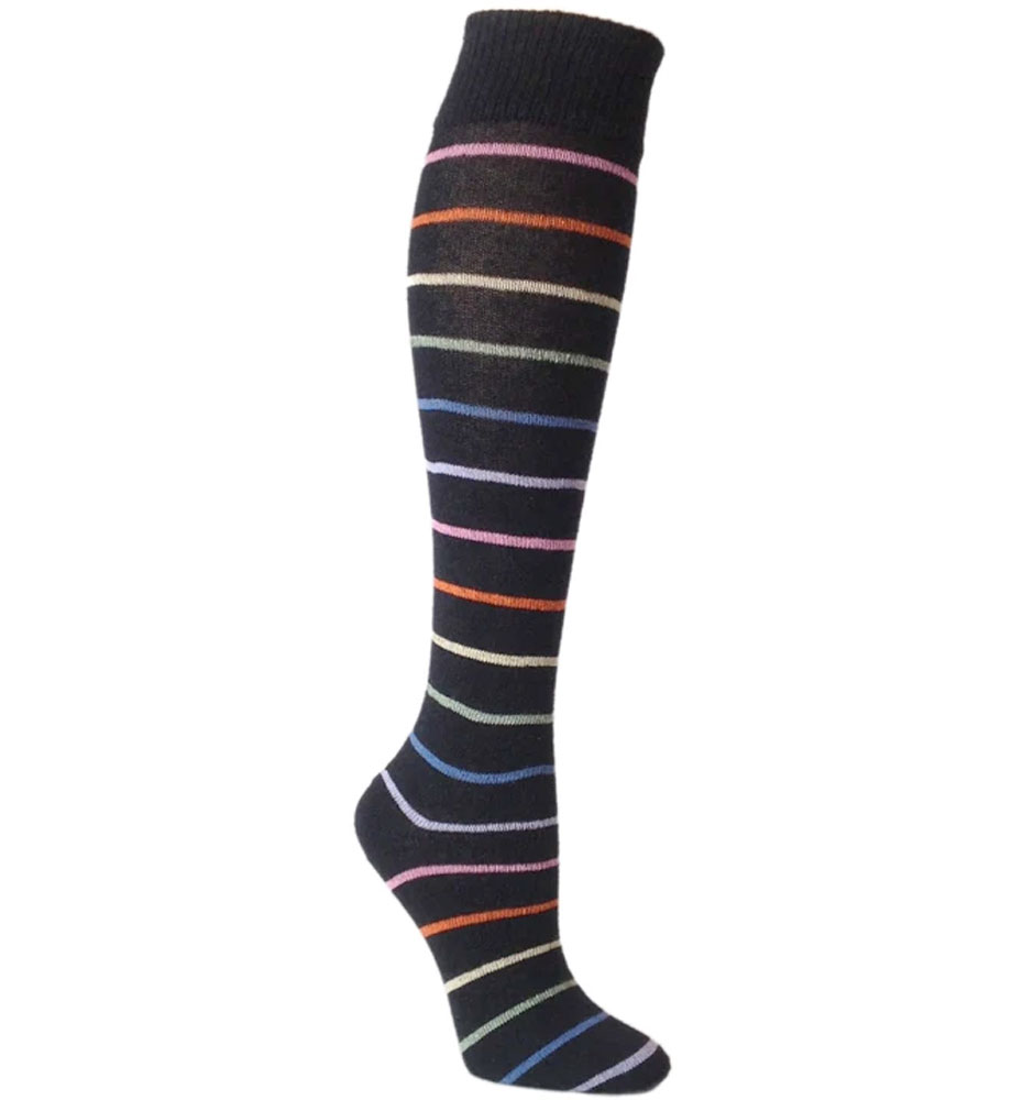 The city lights inspired this black light neon rainbow striped knee high sock. We gonna rock down to electric avenue. Pink, Orange, Yellow, Mint, Azure, and Lilac stripes circle this sophisticated black knee high. Get your 80's retro vibe on!