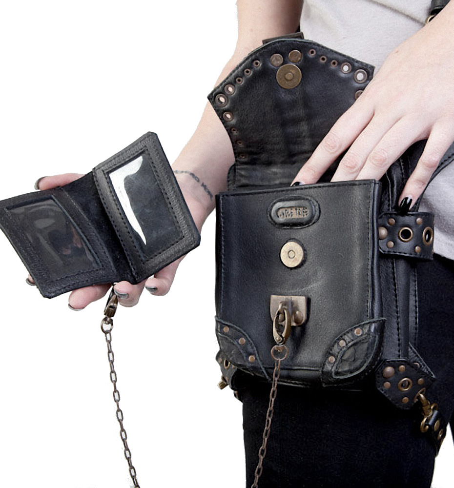 in a pocket that was constructed out of black orange peel leather with lots of straps and clips for safety. and not to forget rivets, brass hardware and chain for that post-modern futuristic style arising from the past. (and just a hint of snakeskin so as to not forget the jungle missions.)