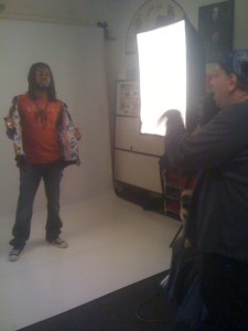 We had the chance to fire off a couple behind the scenes phone shots while the real photography was being conducted by Jeff Cohn of FashionAndAdvertising.com. Jay can be seen wearing styles by Junker Designs, Johnson Motors, Skingraft, Steam Trunk, Heathen, and more!
