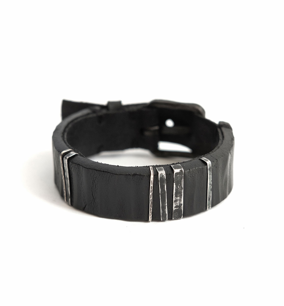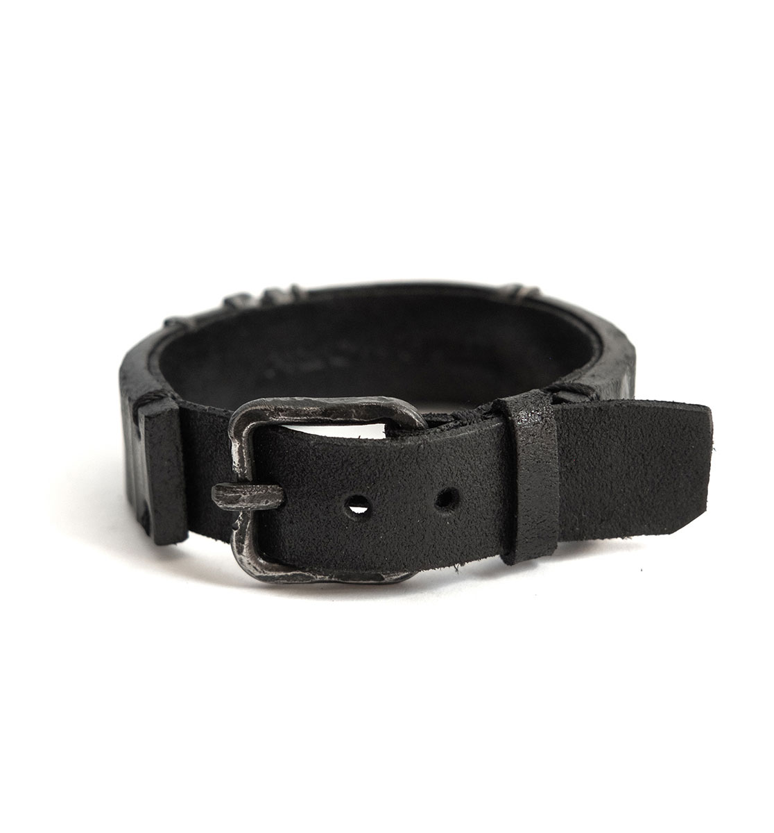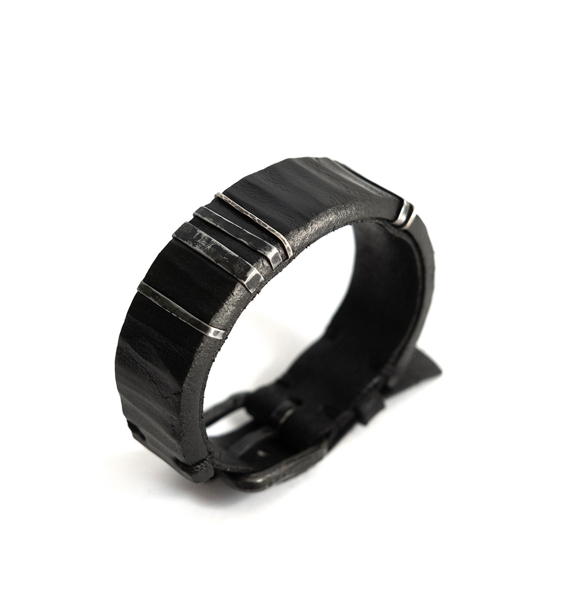 Materials: Genuine leather, Sterling silver and oxidised steel details, Hammered blued steel buckle.