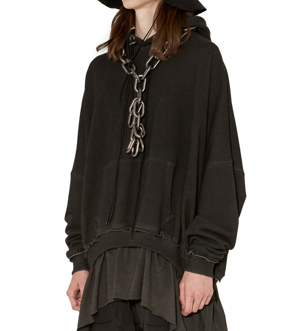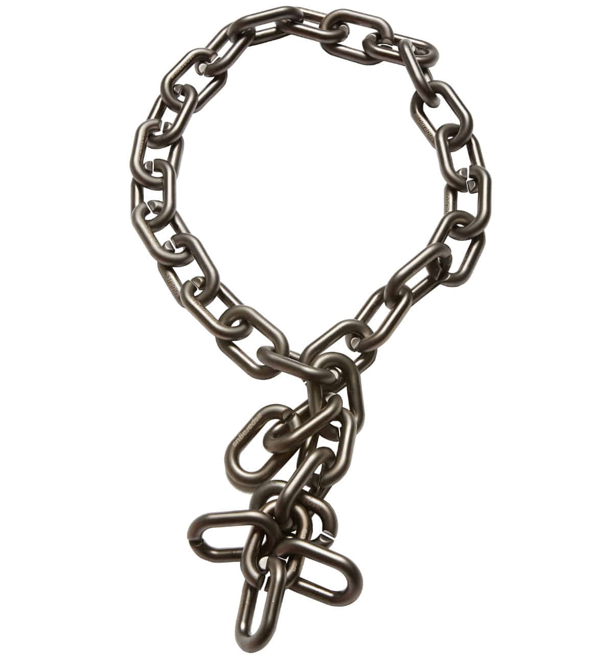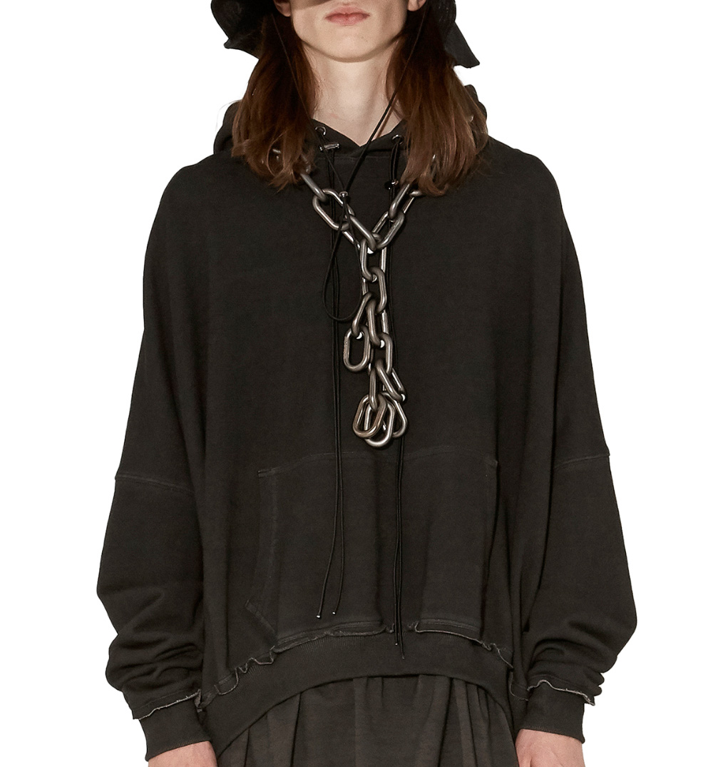 Chains are asymmetrically layered and styled in an avant-garde mood