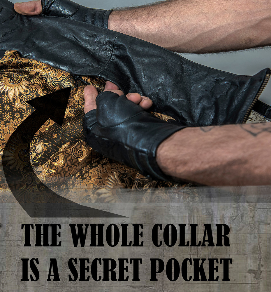 The whole collar doubles as a secret stash. A discreet pocket in the back of the neck is opened by a Japanese style zipper making it very hard to spot.