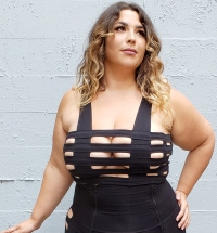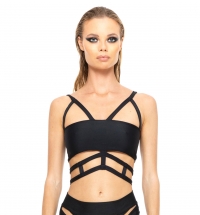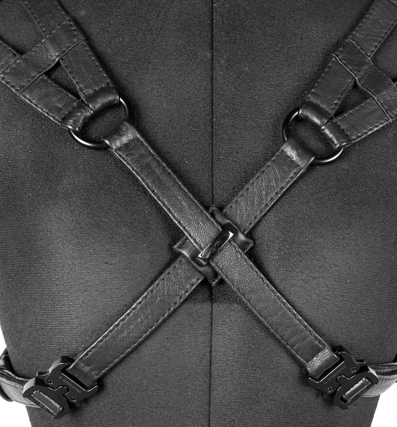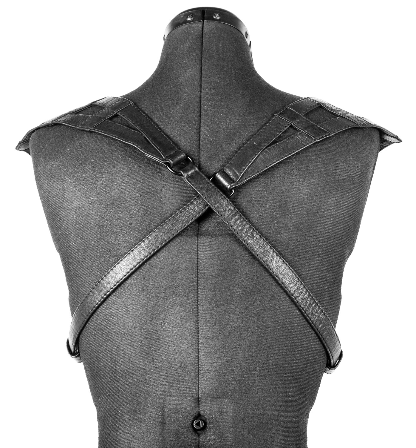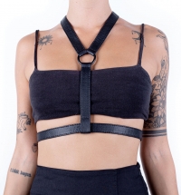A minimalistic, yet intricate shoulder harness in a strap and ring style, framing the upper torso in a diagonal formation , accentuating the nuances of the human body that the linear cross straps encase.