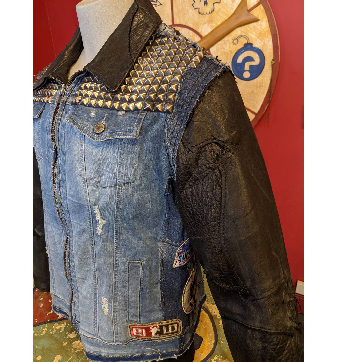 Ripped raw leather sleeves and leather collar. Unique patches on every piece. Since they are all hand made, each one will vary. Runs SMALL - we recommend trading up a size. Any size gladly custom made.