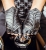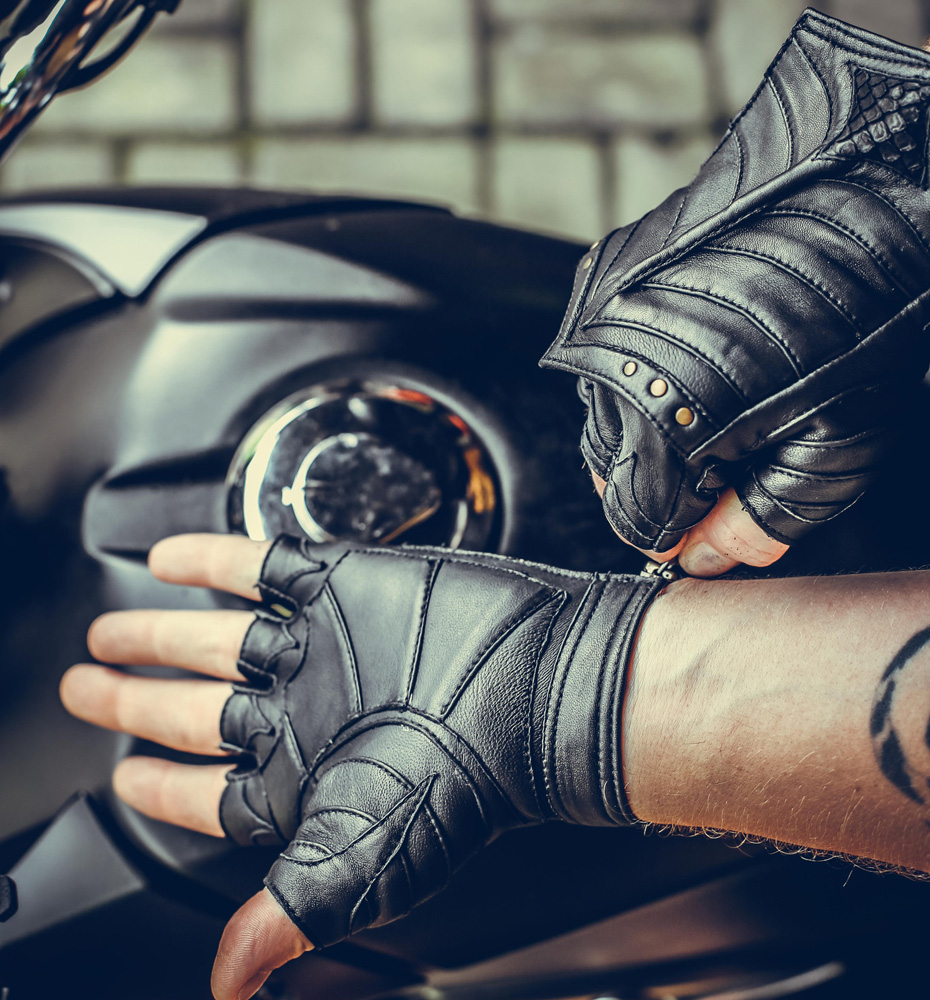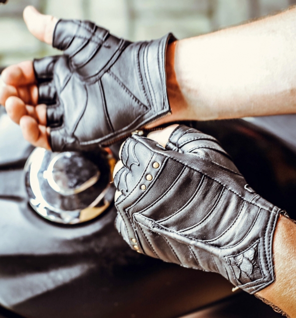 These En(Armored) gloves have many layers of super soft Cabretta leather stitched and molded to be raised off the back of the hand. With articulated thumb panels, and a extra layer of padding on the palm. Accented with rust-free rivets and a small patch of reclaimed python at the wrist.
