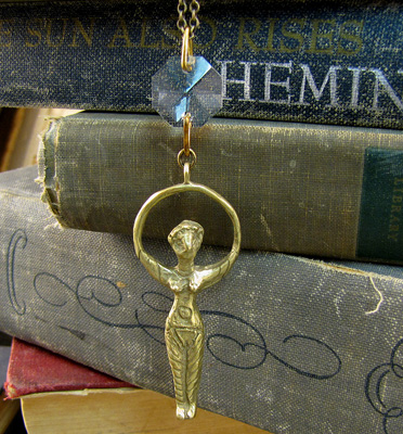 Brass Goddess charm and chandelier crystal on aged brass chain. 32 inches. Goddess pendant measures 2 inches in length.