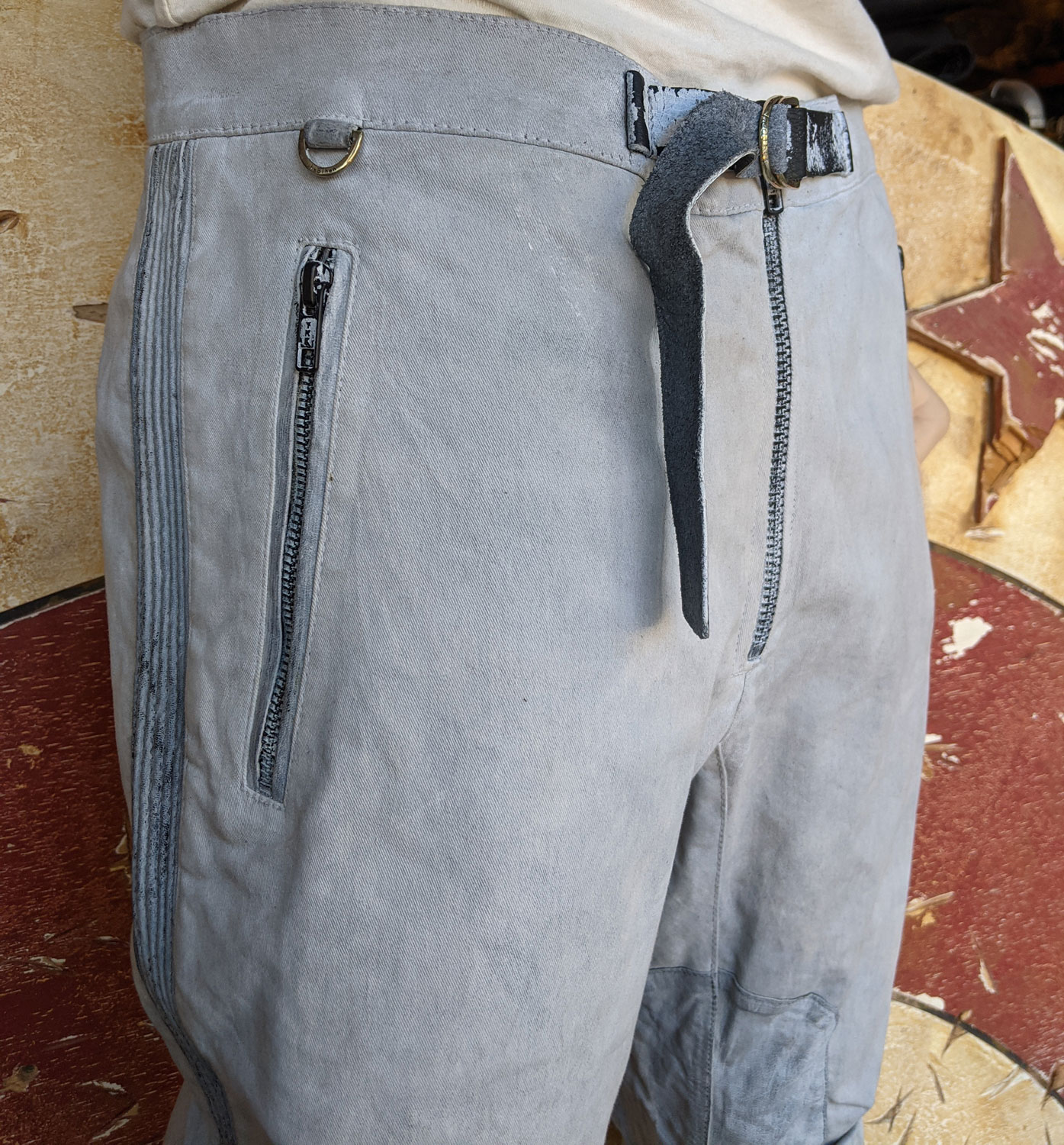 Constructed from cotton twill, with leather detailing. Moto-inspired stretch leather ribbing on the thighs, with a moderate drop crotch and an exposed zip fly to provide ample freedom of movement. Built in d-ring belt closure. Leather edged front and back zip pockets keep your valuables where you want them. Includes the signature Blamo brass key loop.