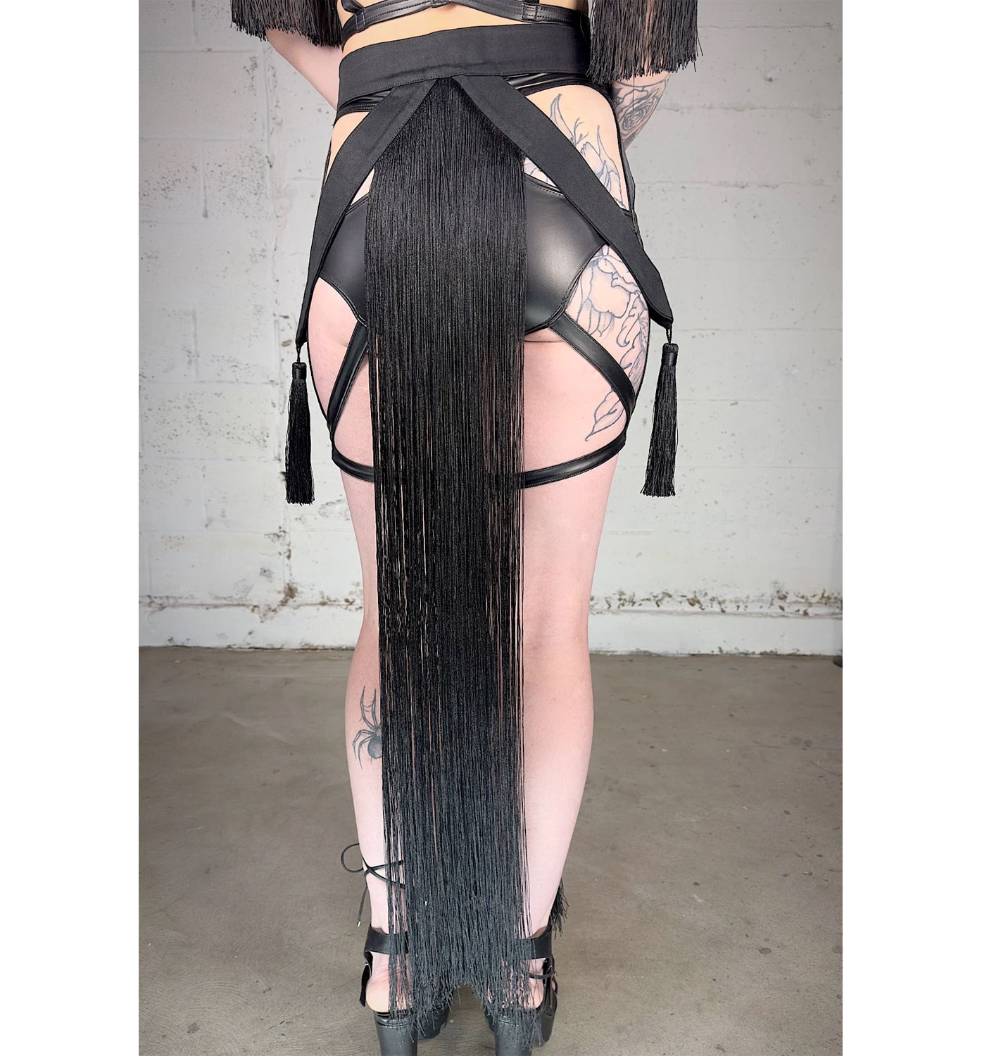Inspired by tribal fusion belly dance, the Harlot Skirt shakes and shimmies. Cotton belt and hip accents with long fringe down the front and back panels. Topped off with fringe tassels hanging from each side.