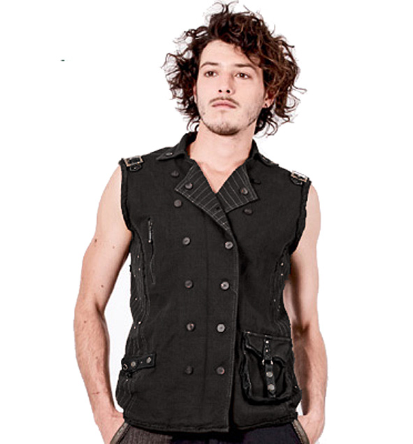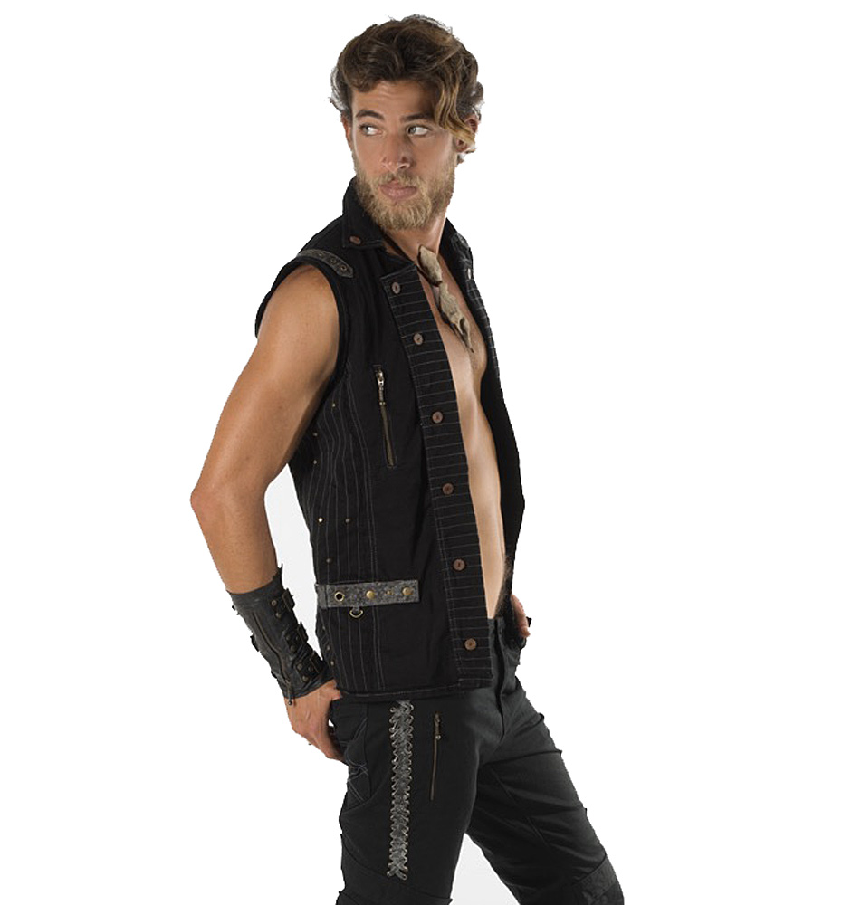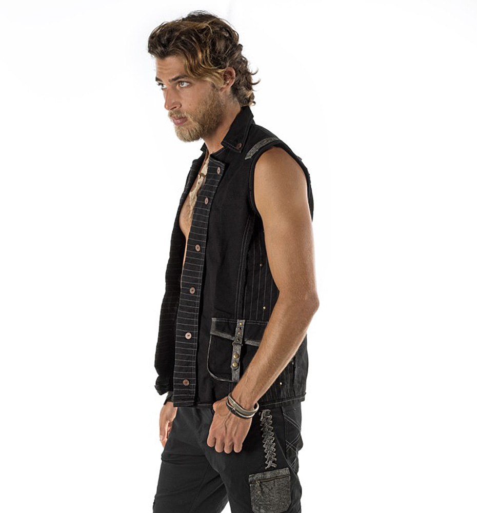 The Industri vest is super spunky and one of a kind. Made of soft & strong cotton canvas, and can be worn by itself, or as a vest. The double breasting allows the panels to be folded back and buttoned open. With leather detailing, studded embellishments, and wooden buttons, not to mention brass belt-buckles and a stunning leather industry-inspired design on the back. 100% steamy and comfortable.