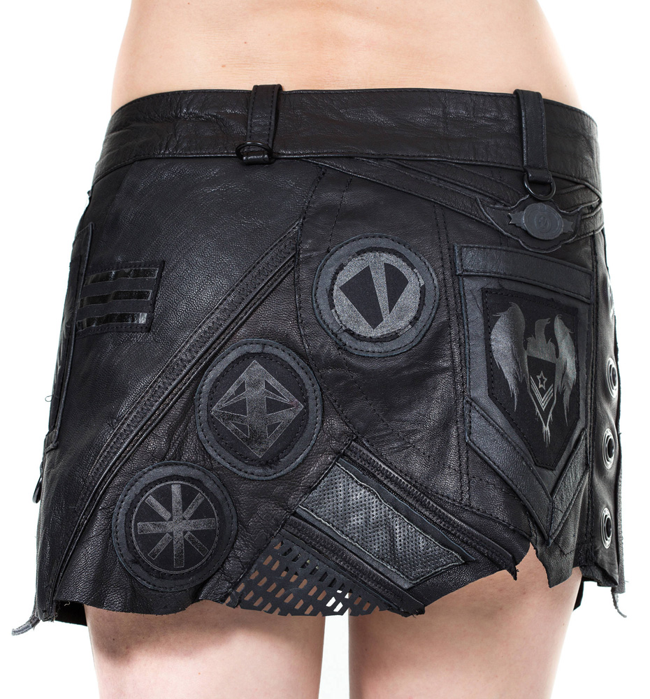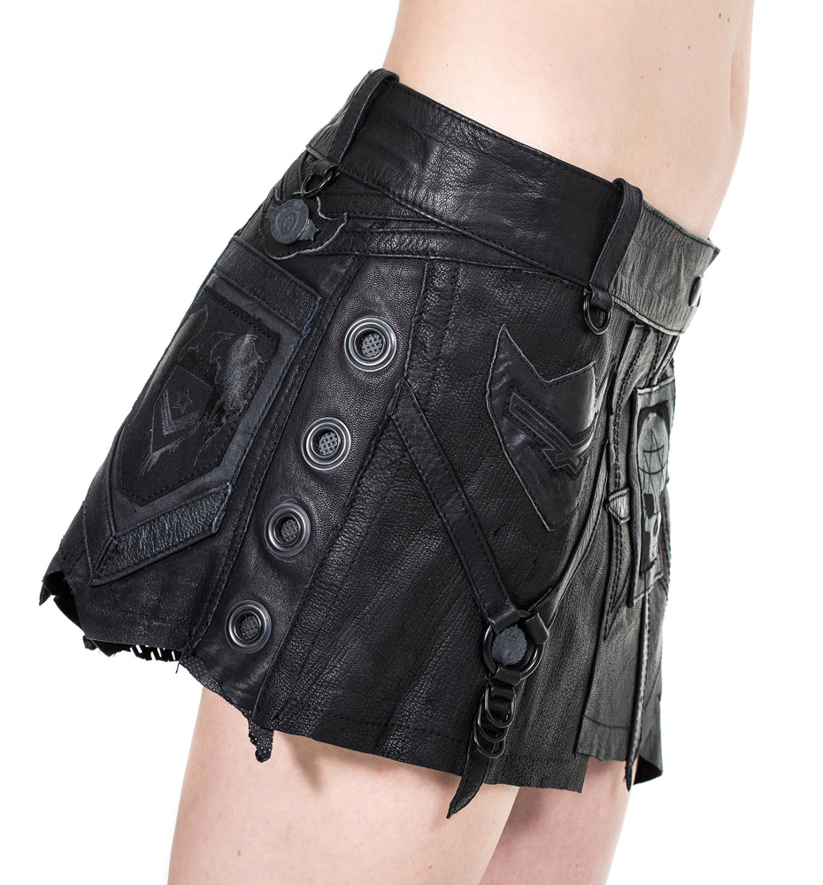 This ultra mini is a work of calculated chaos incorporating multiple leather textures and black on black military inspired patches that create pure unadulterated fashion anarchy.