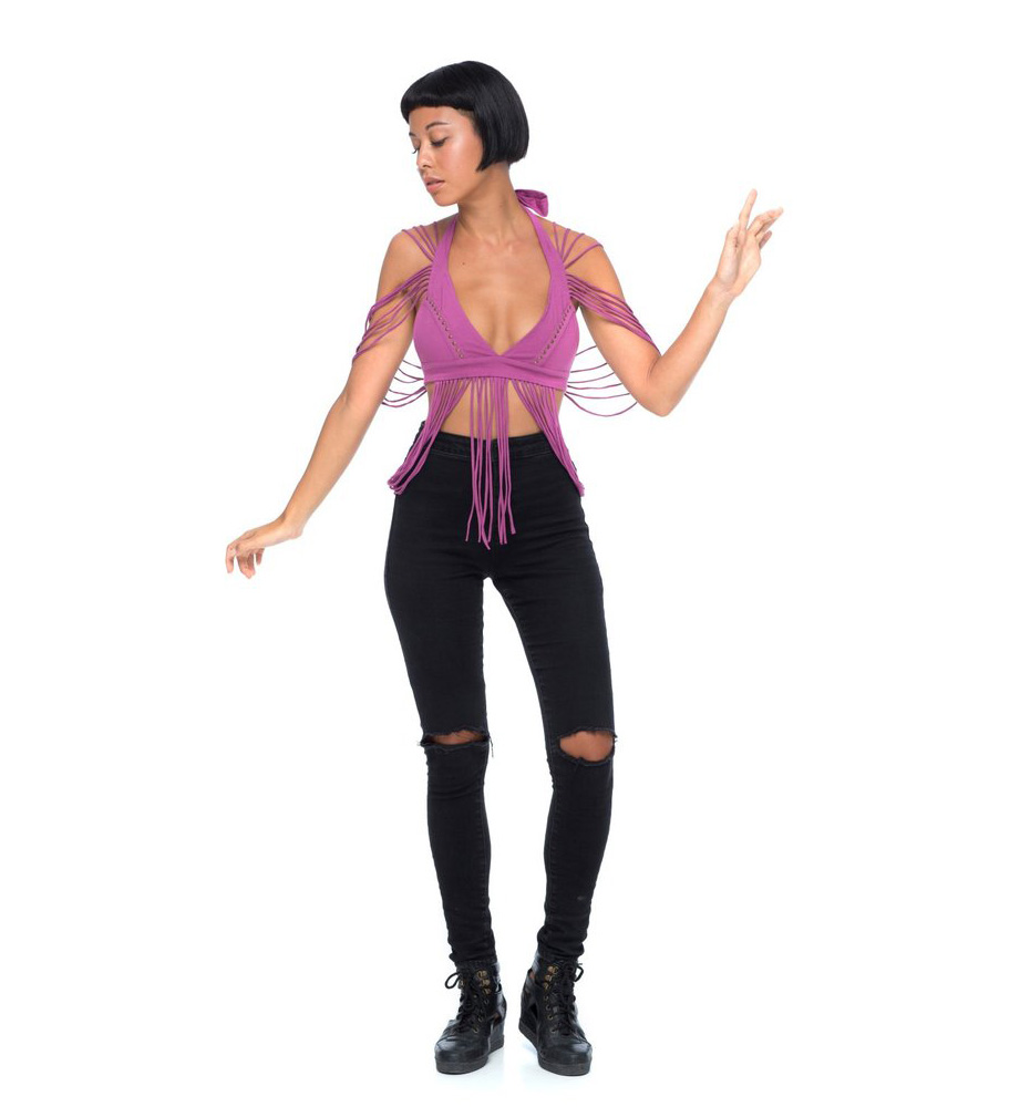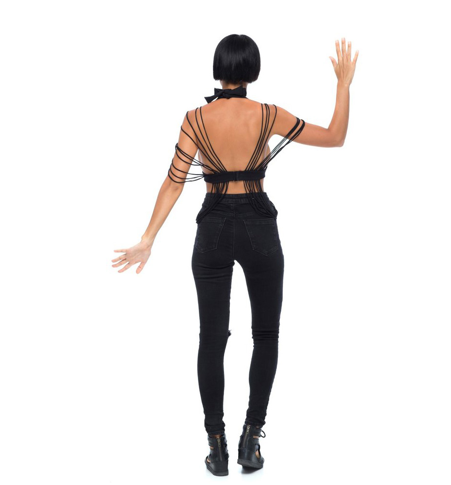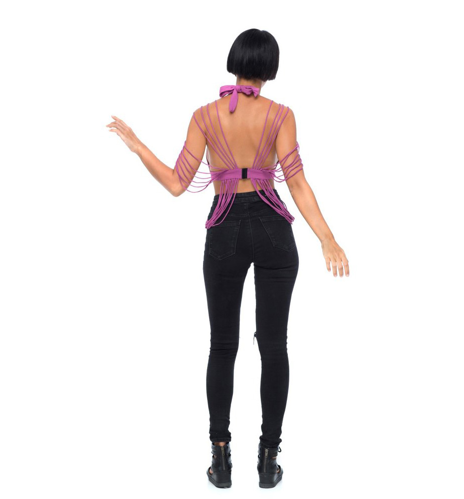 • Draping strings at shoulders and hem that fall over midriff
