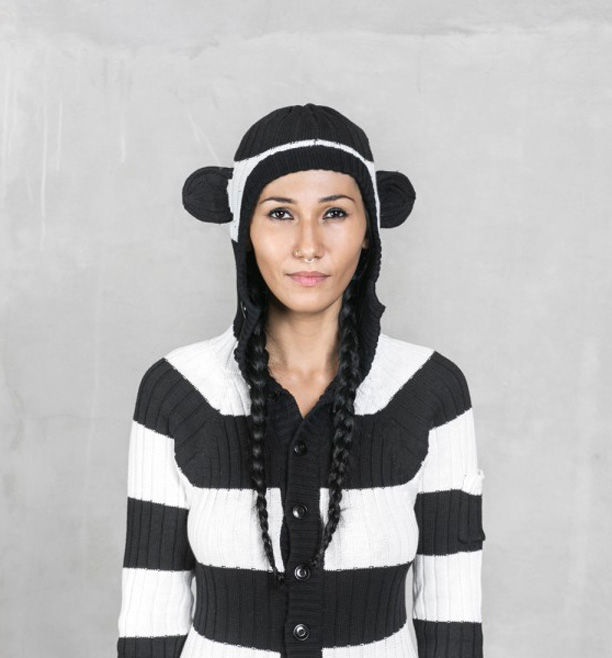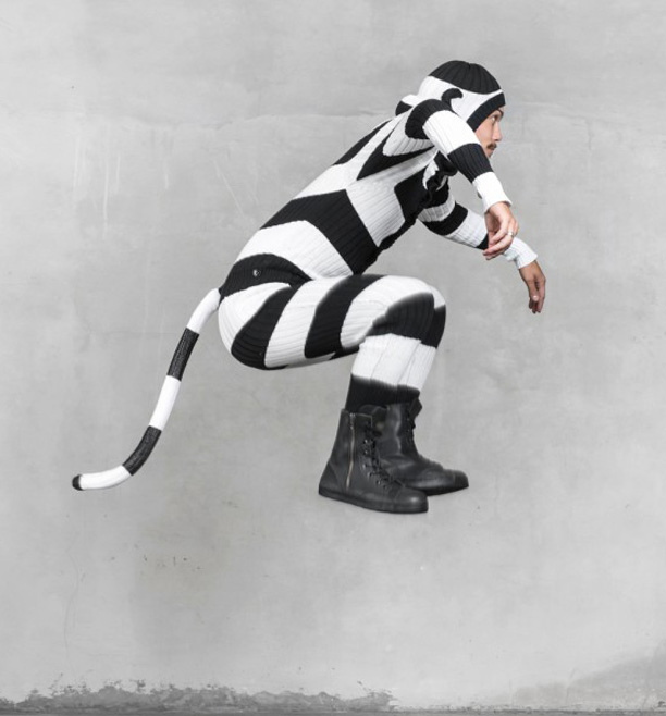 We use 100% cotton knit, which we fabricate using a hand drawn flat knitting machine, a very time intensive process (takes a day just to make the panels), but worth it for the stretchy comfy woven cotton result. Each onesie is fitted with 2 side pockets, 1 shoulder pocket with laser etched Blamo heart patch, thumb holes, knit ears, and a bendable tiger tail.