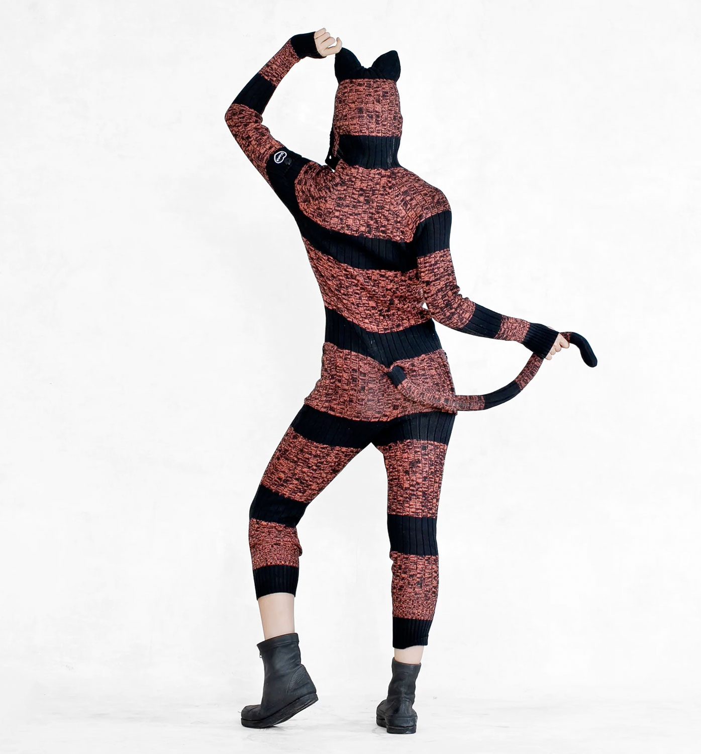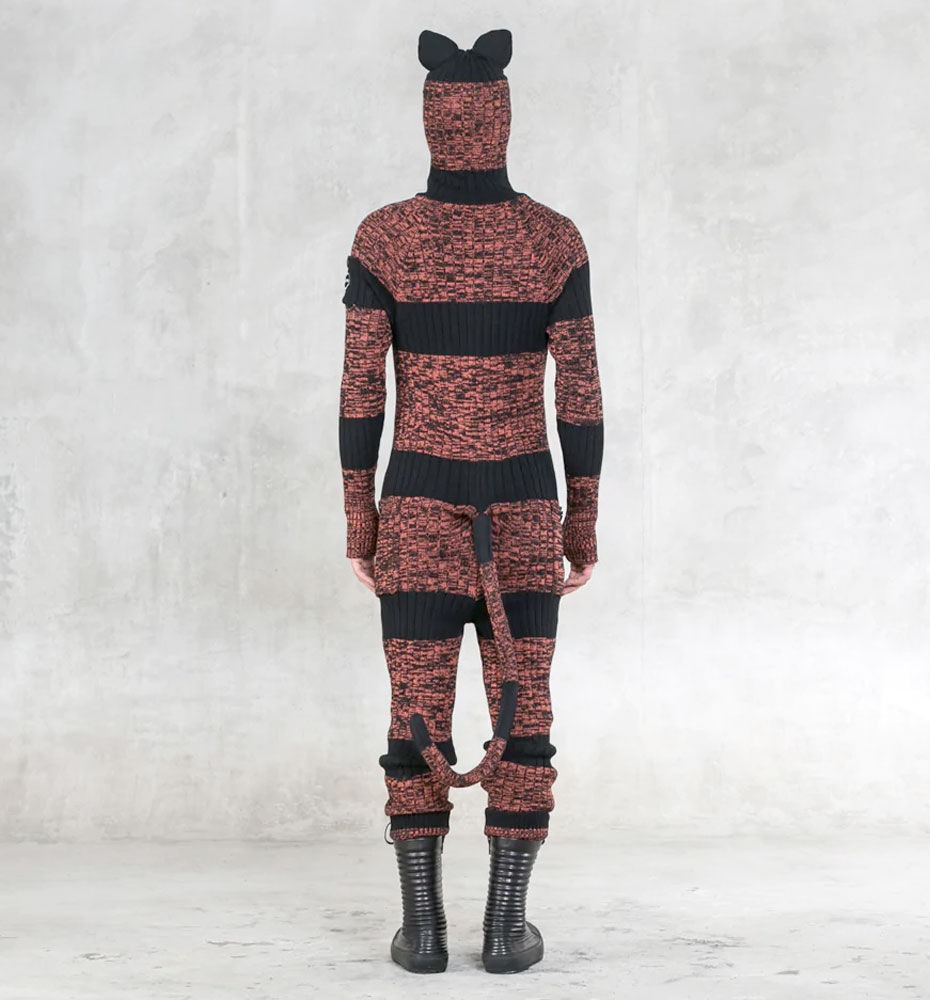 We use 100% cotton knit, which we fabricate using a hand drawn flat knitting machine, a very time intensive process (takes a day just to make the panels), but worth it for the stretchy comfy woven cotton result. Each onesie is fitted with 2 side pockets, 1 shoulder pocket with laser etched Blamo heart patch, thumb holes, foam filled ears, and a bendable tiger tail.