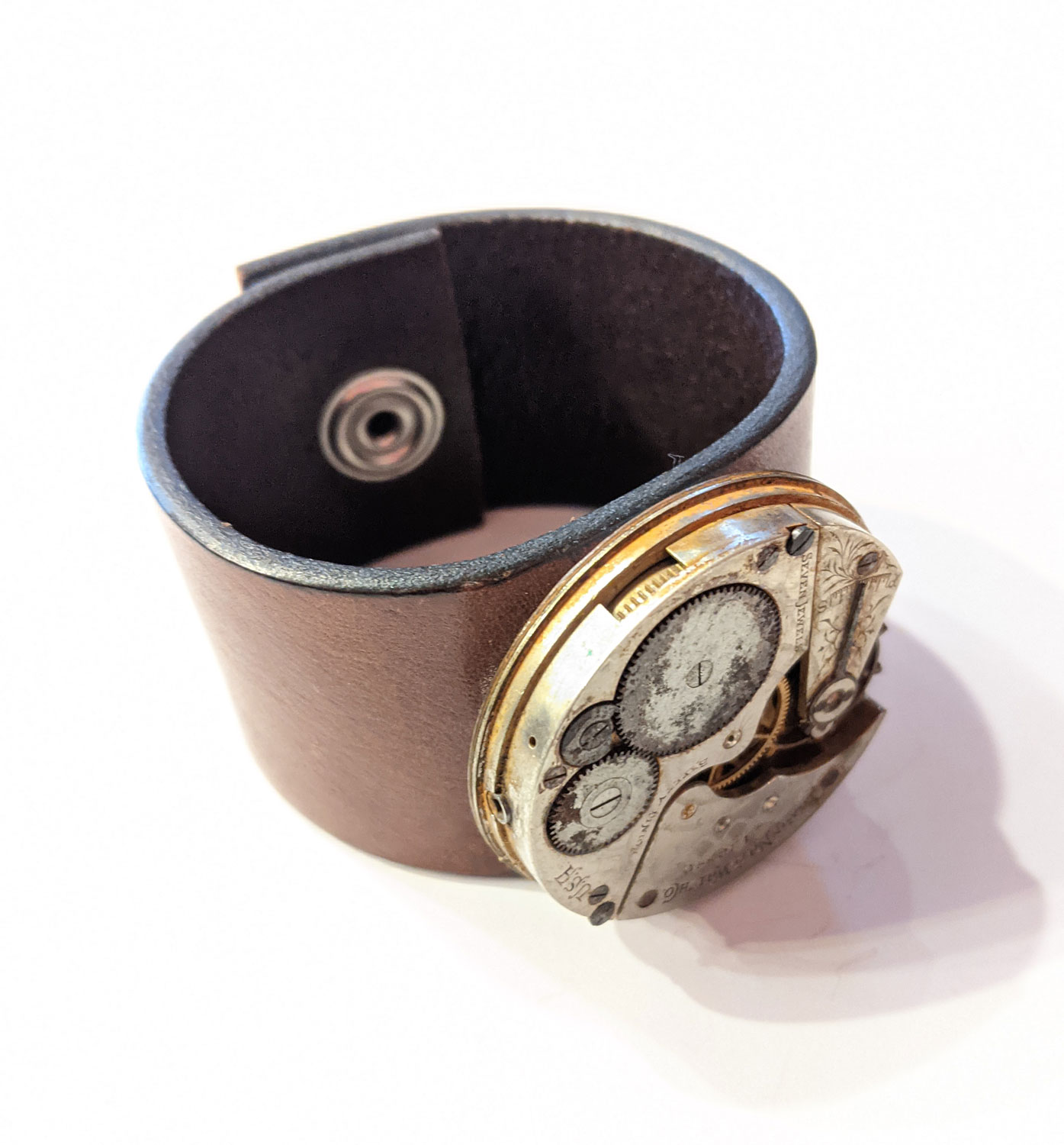 Leather cuff featuring authentic 1910 Elgin Watch workings.