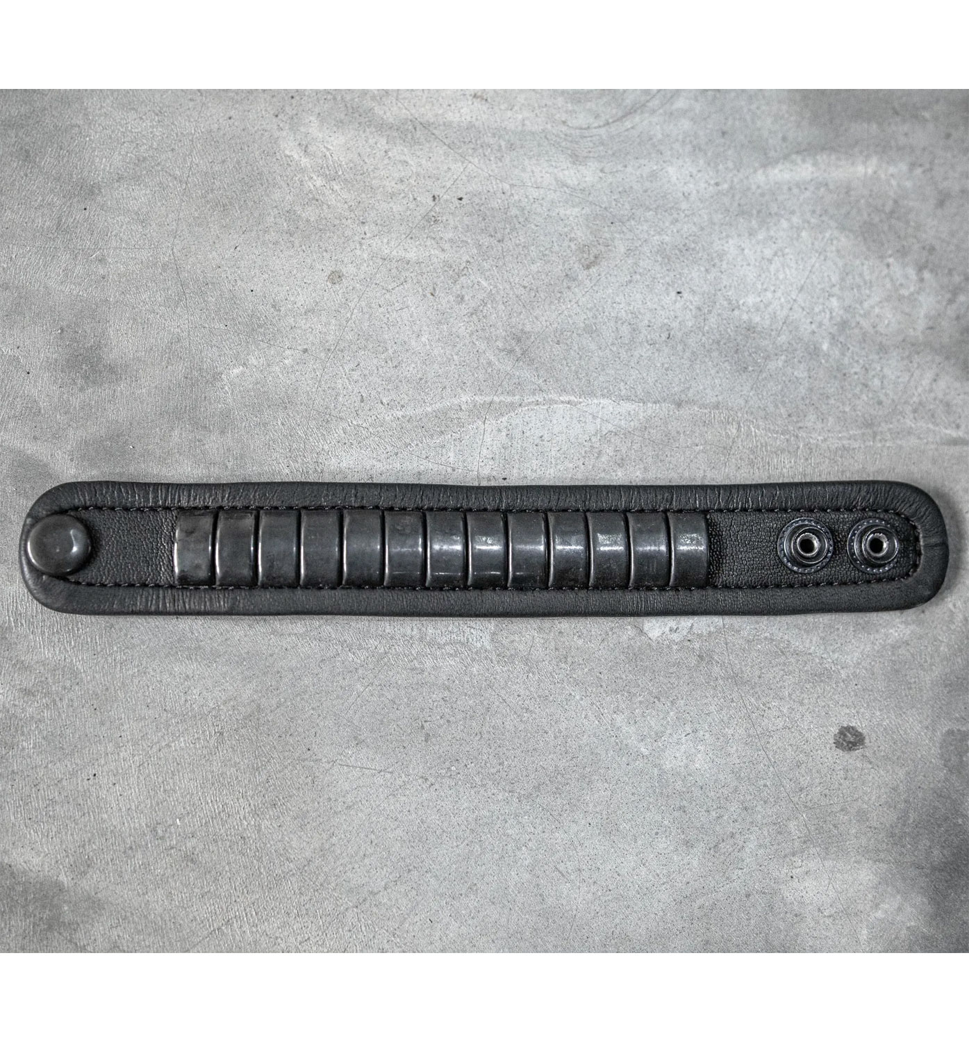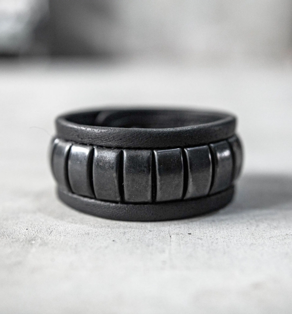 Black leather bracelet, featuring a minimalist design with bold black studs. The genuine leather cuff is sleek, modern, and versatile. It effortlessly blends into any wardrobe, making it the ultimate accessory for those who love understated edge and timeless style.