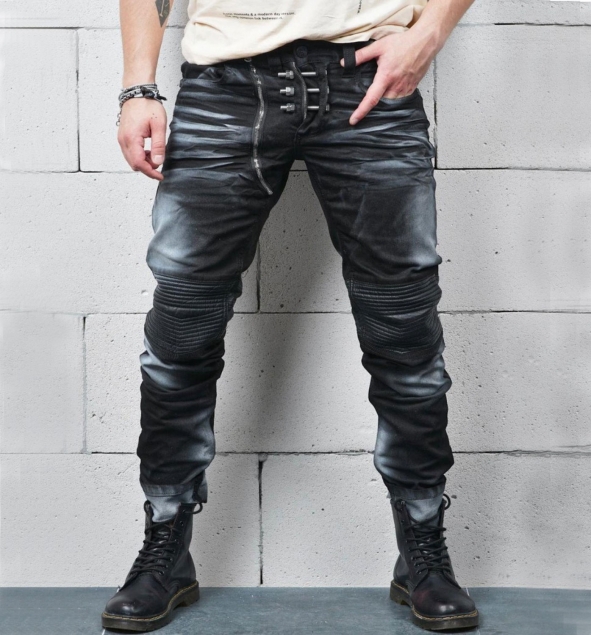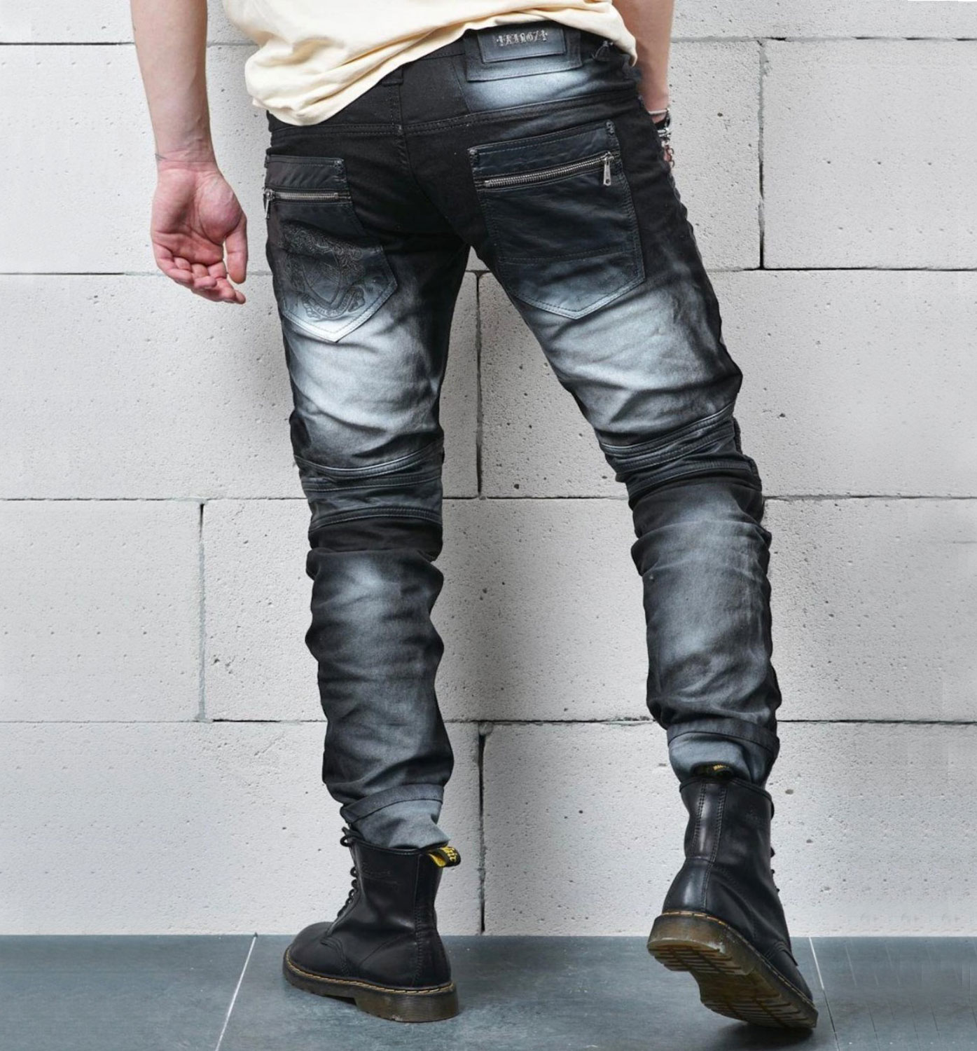 • Unique white spray detailing gives the black denim a dark, smoggy, gritty quality