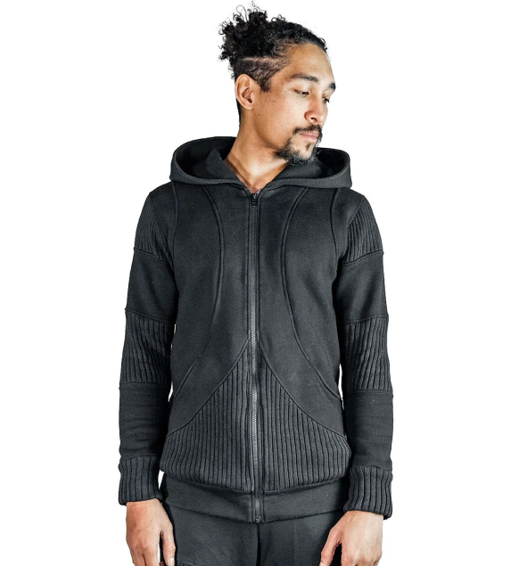 A segmented hoody made from cotton fleece with a thick cotton rib detail throughout. Large hood, zipper front, and 2 large front pockets.