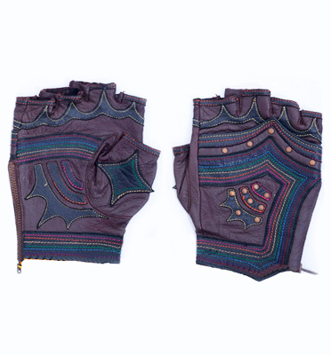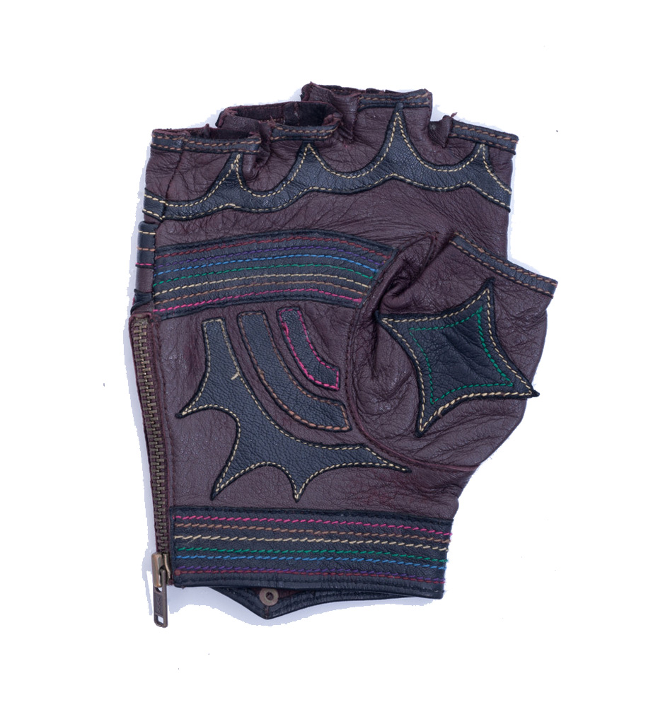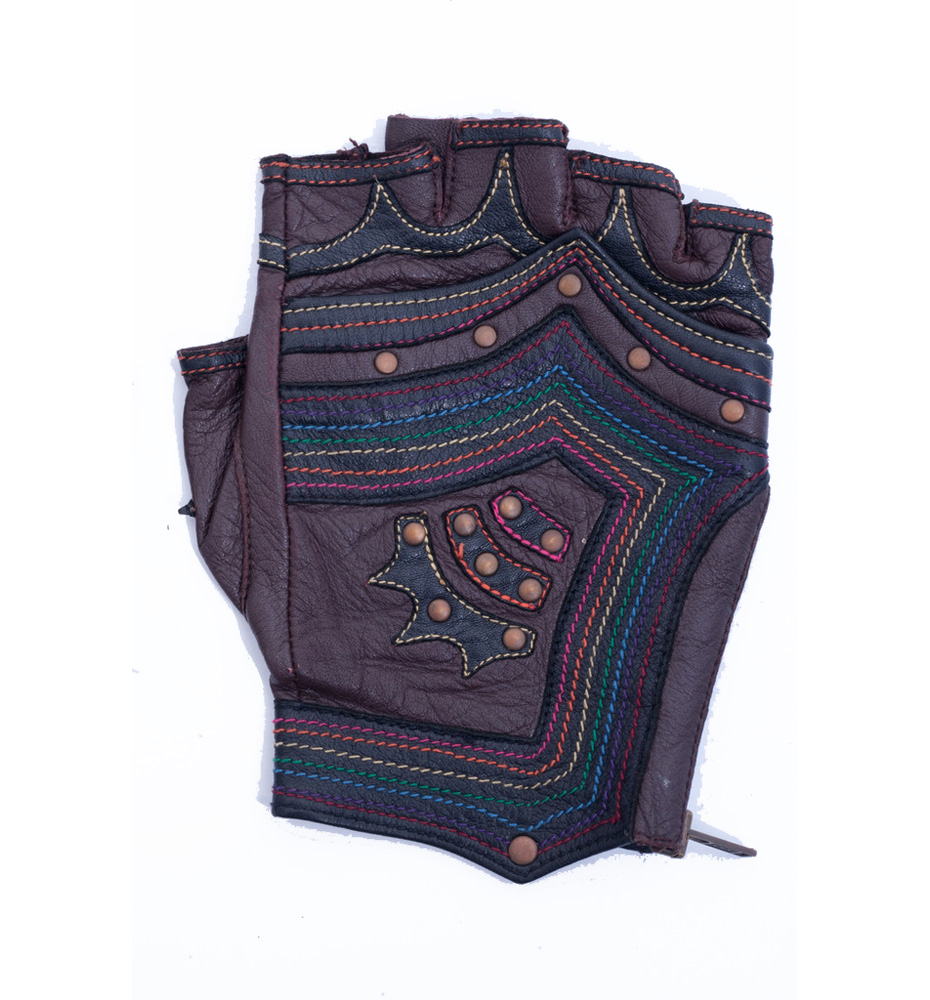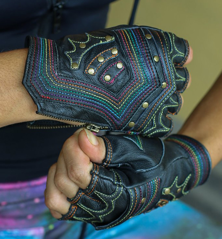The Rainbow Warrior gloves feature Anahata's signature rainbow stitching, two toned leather detailing, and riveted accents extending over the knuckles