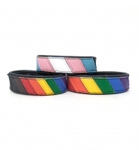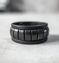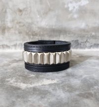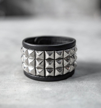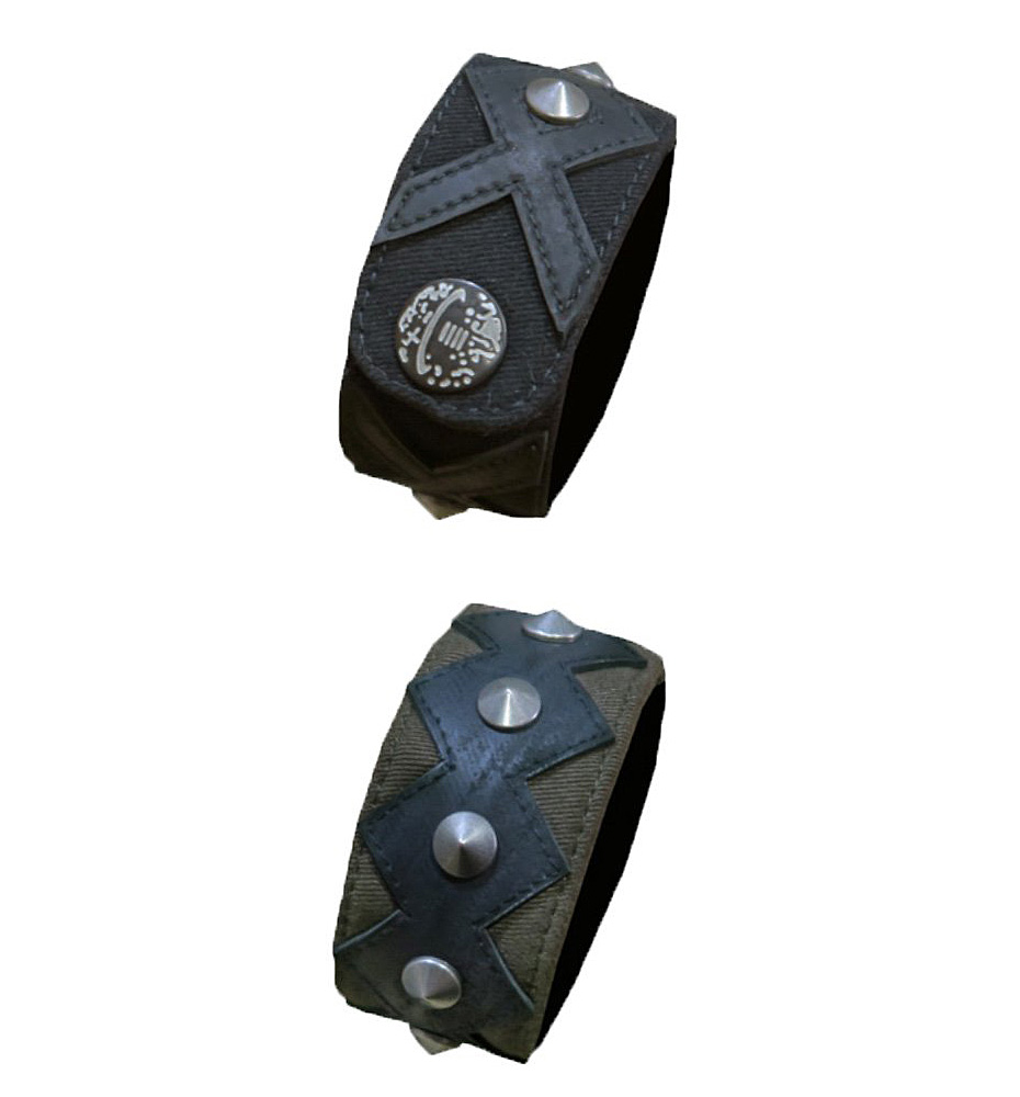 A vegan wristband made of cotton twill, upcycled innertube and metal studs. Adjustable to size with 2 options button closure.