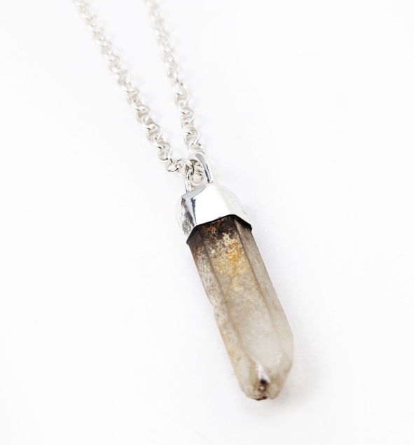 This pendant has a masculine vibe but looks amazing on everyone. A tangerine quartz crystal is the focal point. Purposely imperfect with a rugged but beautiful finish.