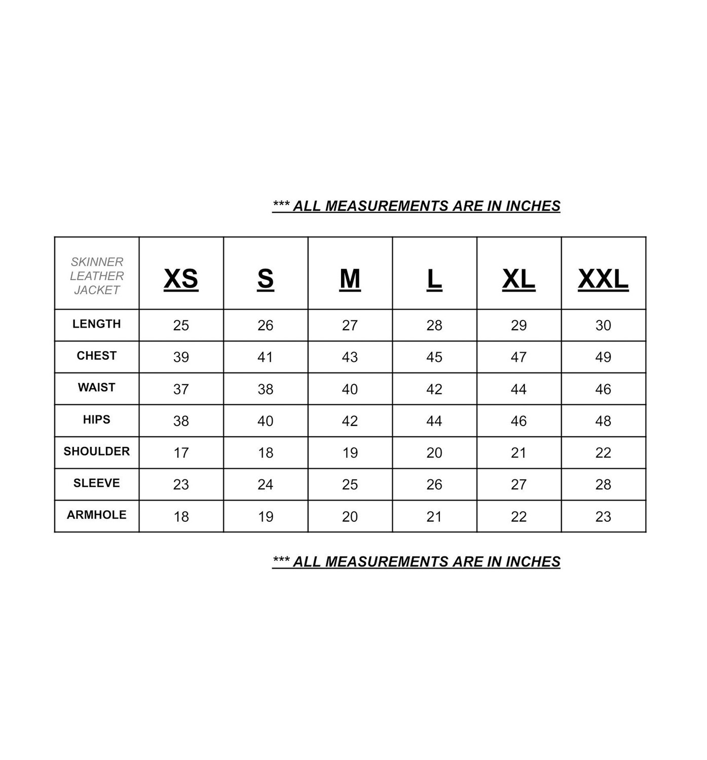 • The chart shows true garment measurements in inches
