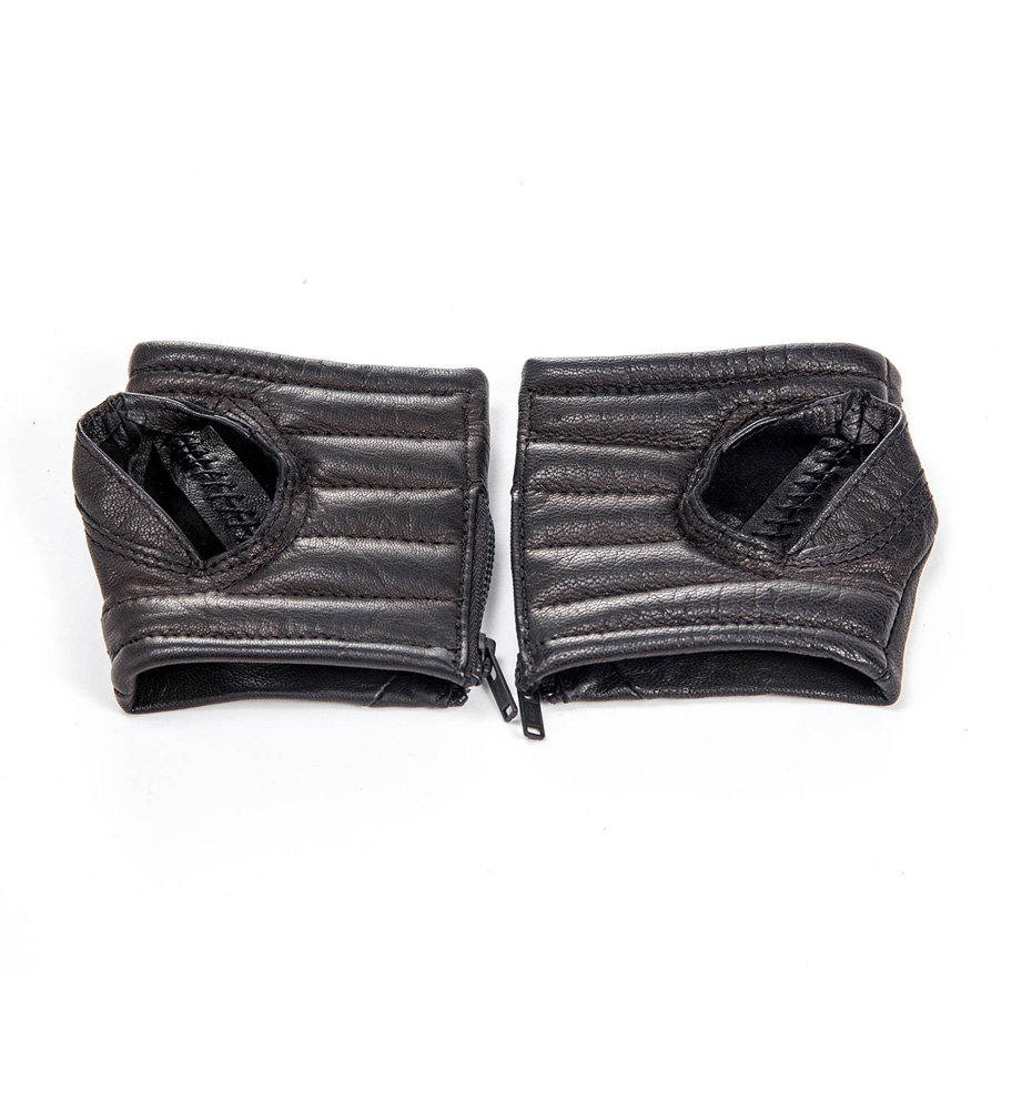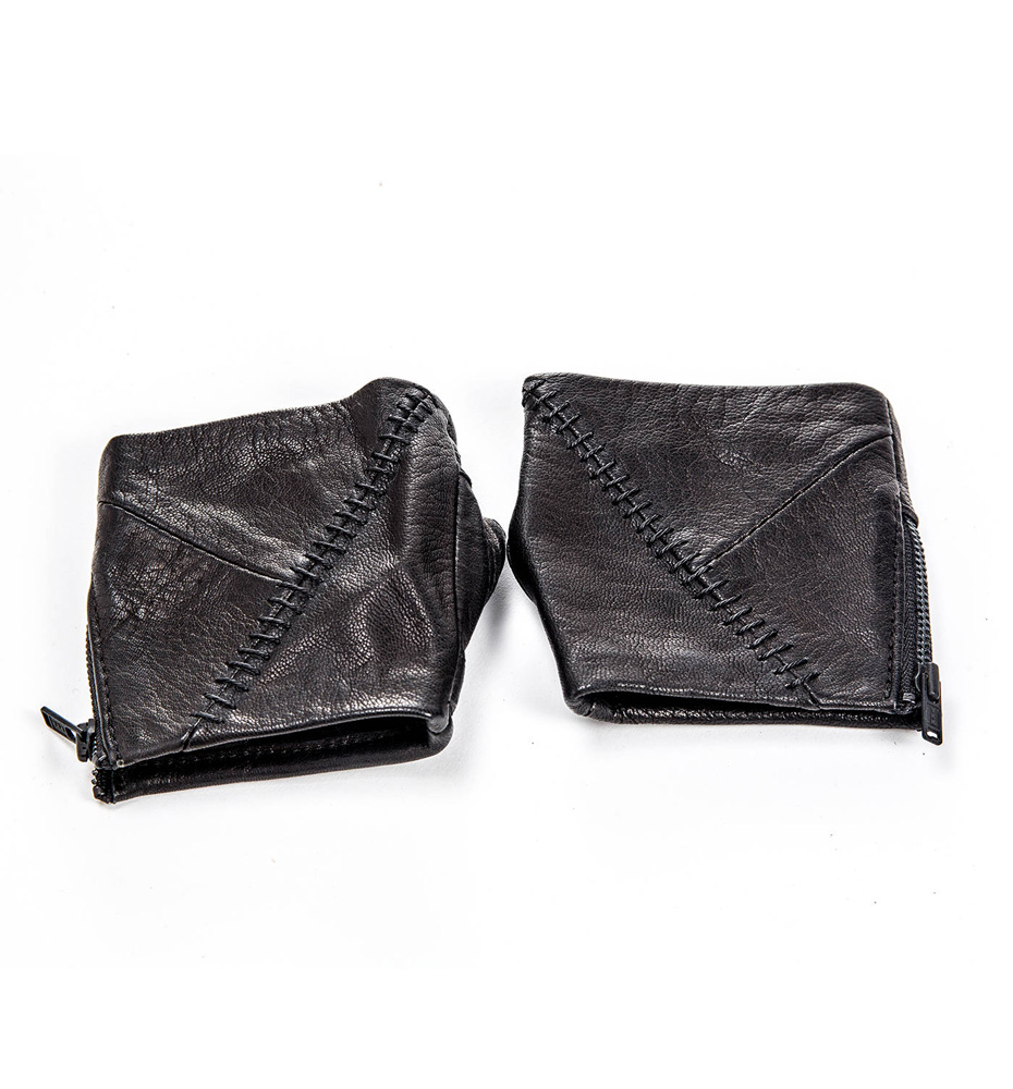 Handmade with an open construction concept to allow maximum movement of the fingers, this simple yet futuristic design also includes a top-side diagonal stitch, with soft padded palms in a tuck and roll arrangement, and smooth, all black side zippers for easy adjustments and removal.