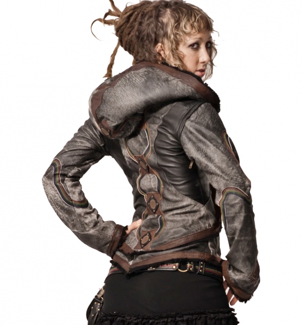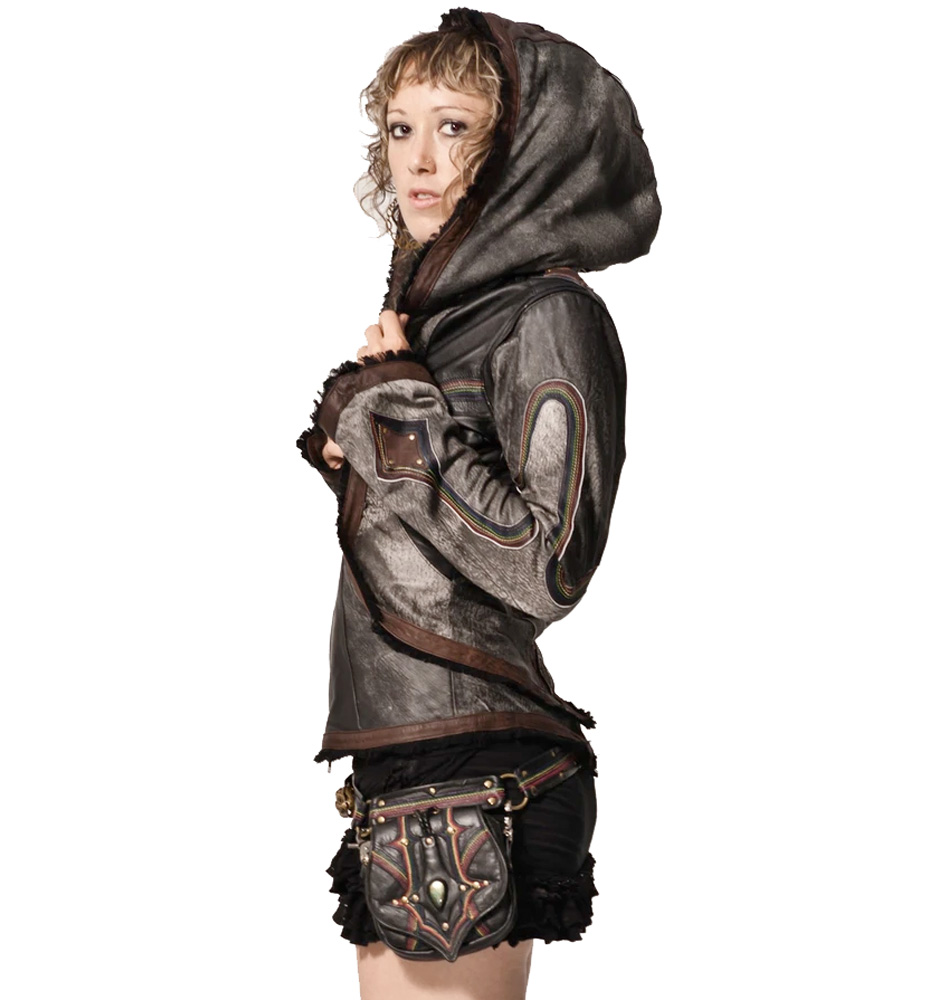 The Rainbow Serpent jacket features hand stitched rainbow detailing that runs the length of the sleeves from the heart and winds from hood to waist. Nestled within the coils of the snake, laser etched leather chakra symbols make this super charged jacket a good match for any cosmic wanderer.