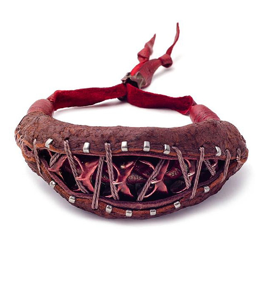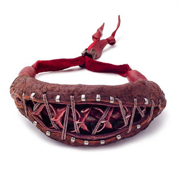 Definitely a conversation starter. Cast spinal bones wrapped in a leather outer layer.